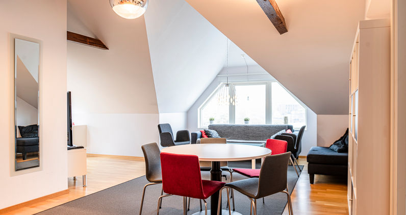 Takvåningen är på 90 m² och består av två sovrum, ett stort vardagsrum, kök, toalett med dusch samt en balkong. Här bjuds det på en fantastisk utsikt över Borgmästarefjärden och centrum. Lägenheten är fullt möblerad , köket är fullt utrustat och har både kyl, frys, spis, ugn, microvågsugn och diskmaskin. I vardagsrummet finns en större Tv. I ett av sovrummet är möblerat med enkelsäng samt ett skrivbord och i det andra sovrummet är det en dubbelsäng. Det finns även möjlighet att nyttja en modern tvättstuga . Bredband och parkeringsplats ingår.Vid veckopendling ingår städning varannan vecka, då handdukar och sängkläder byts. Detta ingår inte vid mer permanent boende. Lägenheten hyrs per månad med kontrakt.